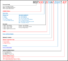An MSP430 part number such as "MSP430F2618ATZQWT-EP" consists of the following pieces: