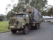 The RM6866RS was an 8-ton 6x6 tactical truck. An EM6 Maxidyne 673 cu in (11.0 L) turbocharged inline 6 cylinder diesel developed 285 hp (213 kW) at 1,800rpm. The Australian Army ordered 940 with delivery starting in 1982. They had right hand drive and were assembled in Australia. Cargo, dump, prime mover, wrecker, fuel tanker, water tanker, bridging, and concrete mixer models were built. The asphalt distributor was a 6x4. The cargo models often carry one APC and tow a full trailer carrying another APC. Containers can also be carried, and some have a self-loading crane between the cab and body.[11]