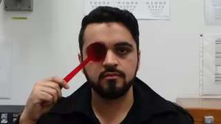 1. The patient is held for granted to hold the Maddox Rod in front of their right with the cylinders vertical, making the red line horizontal.