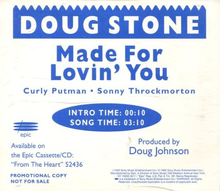 "Made for Lovin' You" is a song written by Sonny Throckmorton and Curly Putman. First appearing on Dan Seals' 1990 album On Arrival,[2] it was also recorded by Clinton Gregory on his album Music 'n Me.[3] Gregory's version of the song was released as a single, but did not chart.