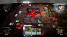 The game's interface was kept separate from the development of the engine, and instead structured in a client–server fashion, with the interface as the client. This was performed in this manner to avoid the complexities of having the user interface to be aware of the complexities of each card, as well as to provide potential reuse of the interface engine.[2] The interface is a "dumb client" that only observes the state of the engine, and is only aware of where cards are on the table and their state, but is not aware of how the cards arrived in their current position. According to the developers, this allows the interface to be "robust and future-proof" for potential expansions.[2]