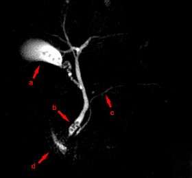 ![]() MRCP image showing stones in the distal common bile duct: (a) Gallbladder with stones, (b) Stones in bile duct, (c) Pancreatic duct, (d) Duodenum. | |