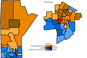| Map of Manitoba with the ridings coloured to indicate the winning parties and their popular vote | |||||||||||||||||||||||||||||||||||||||||||||||||||||||||||