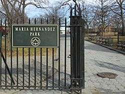 Maria Hernandez Park is a municipal park in Bushwick, Brooklyn, New York City. It is located between Knickerbocker Avenue on the southwest to Irving Avenue on the northeast, and Starr Street on the northwest to Suydam Street on the southeast. The park is 6.87 acres (2.78 ha) and is near the Jefferson Street station of the New York City Subway (L train). Maria Hernandez Park also has four wheelchair accessible entrances. It has a newly renovated basketball court, handball court, fitness equipment, spray showers and benches, and a newly built performance stage. The playground was rebuilt with brand new equipment thanks to funds from the Mayor and the City Council.[1]