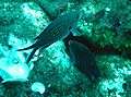 | Chalk bass | ![]() | Serranus tortugarum | Yes | Easy to Moderate | Blue iridescent body with distinctive black topside that is interrupted by small vertical blue stripes. | 8 cm (3.1 in) |