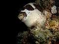 - Masked puffer at night, resting (sleeping?) on a coral outcrop