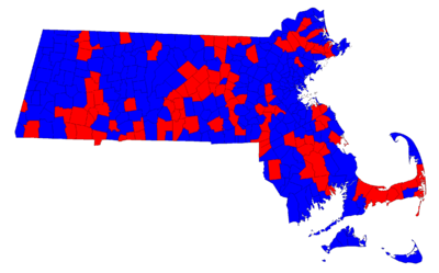 | Results by town. Red indicates towns carried by Mitt Romney, blue indicates towns carried by Ted Kennedy. | |||||||||||||||||||||||