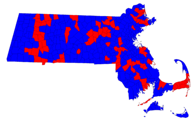 | Results by town. Red indicates towns carried by John W. Sears, blue indicates towns carried by Michael Dukakis. |