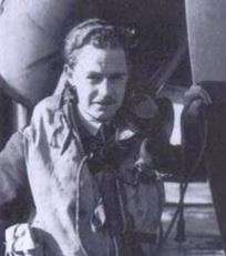 A young Pilot Officer Maxwell Nicholas Sparks, standing with his hand on (probably) the propeller of his Mosquito FBVI, serial HX982 (coded EG-T) | |