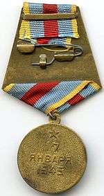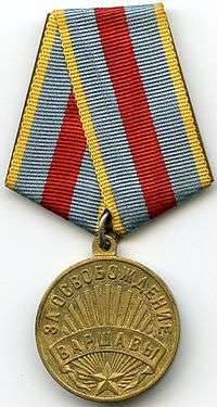 The Medal "For the Liberation of Warsaw" (Russian: Медаль «За освобождение Варшавы») was a World War II campaign medal of the Soviet Union established on June 9, 1945 by decree of the Presidium of the Supreme Soviet of the USSR[1] to satisfy the petition of the People's Commissariat for Defence of the Soviet Union.