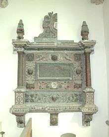 St Swithun's most notable monuments are wall-mounted ones in the chancel commemorating John Doyley (died 1593) and his wife, Elizabeth Poole (died 1621) and Richard Harrington (died 1712).[9] The Poole monument has strapwork and Tuscan columns but is significantly mutilated[8] and in want of restoration.