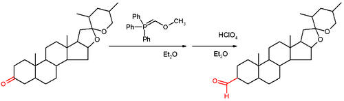 Methoxymethylenetriphenylphosphine is a Wittig reagent with used as an reagent in the homologization of aldehydes and ketones to extended aldehydes, an organic reaction first reported in 1958 . This reagent is quite unstable to even mild temperatures and water. As such it must be made in situ, taking on a blood red color, indicative of destabilized ylides.