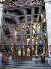 The Altar of the Kings was also the work of Jerónimo Balbás, in Mexican Baroque or Churrigueresque style.[7] It was begun in 1718 by Balbás[13] in cedar, and was gilded and finished by Francico Martínez, debuting in 1737.[5] It is located at the back of the Cathedral, beyond the Altar of Forgiveness and the choir. This altar is 13.75 metres (45.1 ft) wide, 25 metres (82 ft) tall and 7.5 metres (25 ft) deep. Its size and depth gave rise to the nickname la cueva dorada ("the golden cave").