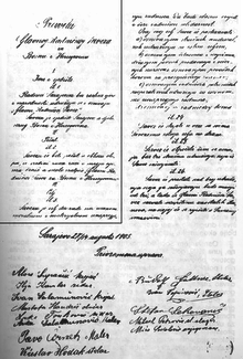 The first public assembly of workers in Bosnia and Herzegovina was held as planned, on 27 August 1905; it had around 350 participants. The provincial government sent an envoy to be present at this gathering. It was presided by Alojz Supančič (a textile worker, originally from Slovenia), and its minutes were recorded by Sokolović and Mustafa Handžić (a shoemaker).[7] The assembly accepted the proposition to found the General Workers' Union (Glavni radnički savez), the main goal of which was "to work on the intellectual, moral and material advancement of workers, to awaken their class consciousness, and to spread solidarity among them". The Rules of the General Workers' Union (Pravila Glavnog radničkog saveza), whose articles were composed by Sokolović, was also unanimously accepted. The assembly elected a provisional management of the organisation, with Ilija Kamber (a construction worker) as its president and Sokolović as its secretary.[9] It was the first trade union to be founded in Bosnia and Herzegovina.[6] Beside this general union, during September 1905 similar assemblies founded six trade unions organised along the lines of particular trades. All these organisations and their Rules had to be approved by the central Ministry of Finance in Vienna and the provincial government, which would take about a year.[10] A more lenient attitude of the Austro-Hungarian government toward workers' demands and organisations resulted partly from their fear that something similar to the Russian revolution of 1905 might happen in their empire. They saw that further repressive measures against organised workers might lead to a serious social and political unrest, but they sought to make the worker's organisations apolitical and to place them under their control.[7]