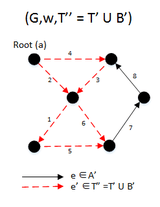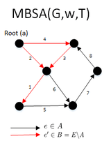 For a directed graph, Camerini’s algorithm focuses on finding the set of edges that would have its maximum cost as the bottleneck cost of the MBSA. This is done by partitioning the set of edges E into two sets A and B and maintaining the set T that is the set in which it is known that GT does not have a spanning arborescence, increasing T by B whenever the maximal arborescence of G(B ∪ T) is not a spanning arborescence of G, otherwise we decrease E by A. Total total time complexity is O(E log E).[3][4]