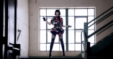 The second verse shows her in the garden dress, where she continually rides an elevator through the warehouse; in a separate scene, the background dancers also ride the elevator. In front of a flower wallpaper, Stefani wears a fluffy, pink dress where she gracefully falls to floor. The next chorus displays Stefani in a black bob wig, "walk[ing] effortlessly down some stairs in patent leather, thigh-high stilettos".[52] The song's bridge has Stefani wearing a black and white leotard with thigh-high silver boots, while sitting on a stool.[49] A black horse appears, alongside Stefani in a black and white-striped dress, before she slowly runs away from the horse. The song's final chorus has Stefani riding a bicycle through a brightly-lit parking garage,[53] before she returns to the smoke machine and, once again, falls to the ground. As the song concludes, the screen fades to black.[49]