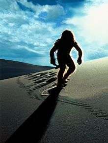 Missing Link is a 1988 film written and directed by Carol and David Hughes. The movie is set in Africa roughly one million years ago, at a time when one species of "man-apes" (Australopithecus robustus) was being displaced by the ancestors of modern humans (possibly Homo erectus but they are never named. They are only addressed as man and from the few scenes where they show any visibility, they vaguely resemble modern humans). The film follows the last of the man-apes (Peter Elliott) as he wanders through the wilderness after his tribe is slaughtered by the aggressive humans who have invented the ax and have learned to make use of fire. He journeys through a savanna, an oasis, a desert, and eventually the shores of a beach. Along the way, he avoids the humans that killed his family and witnesses many fantastic sights of wildlife. After experiencing a hallucination brought on by ingesting a hallucinogenic plant (possibly a reference to the stoned ape theory), he realizes the stone ax that he has been carrying after finding it at the site where his tribe was killed is a weapon. When he comes across a human footprint at the ocean shore, he sniffs it and then starts hitting it, wanting revenge against the humans. But he then relents and tosses the ax into the ocean. The closing scene has him sitting mournfully on the beach as the sun sets. The closing text states that the "man-apes" were likely the first species humanity pushed into extinction.