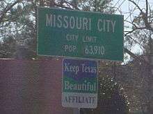 Missouri City is a city in the U.S. state of Texas, within the Houston–The Woodlands–Sugar Land metropolitan area. The city is mostly in Fort Bend County, with a small portion in Harris County. As of the 2010 census, the city had a population of 67,358, up from 52,913 in 2000.[3] The population was estimated at 74,139 in 2015.[4]