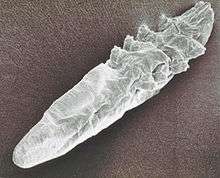 One genus of mites, Demodex, has adapted to infesting the hair follicles of its hosts. Most species of mammal, including humans, are readily infested with these minute mites, but typically the infestation level is very low.[8] The individual mites remain external to the epidermis within the follicle, but appear to be within the skin because they are below the general outer surface of the host. The mite Demodex canis is a common cause of demodecosis in dogs. Demodex mites are microscopic, worm shaped and have very short legs. These mites seem to feed on epidermal cells. They can crawl out on the surface of the skin, aided by secretions from the skin's sebaceous glands. Puppies become infected by close contact with the bitch during suckling. Puppies are more susceptible to infestation at this age because their immune system is immature. All dogs will become infested in this way but usually and in the long term only low levels of infestation persist, without pruritus or other signs of clinical disease. Some dogs become heavily infested, probably because of an immune dysfunction. This results in severe inflammation of the epidermis, with acanthosis. The skin may become so thickened that folds form, and bacterial infection of excessive sebaceous secretions (seborrhea) may occur, producing an offensive smell. Demodecosis in cattle can occur as dense localized infestations. These create pustular folliculitis and indurated plaques within the dermis. This diminishes the commercial value of the animal's hide.[9]