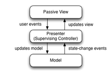 The model-view-presenter software pattern originated in the early 1990s at Taligent, a joint venture of Apple, HP, and IBM, and was the underlying programming model for application development in Taligent's C++-based CommonPoint environment. The pattern was later migrated by Taligent to Java and popularized in a paper by Taligent CTO Mike Potel.[3] After Taligent's demise in 1997, Andy Bower and Blair McGlashan of Dolphin Smalltalk adapted the MVP pattern to form the basis for their Smalltalk user interface framework.[4] In 2006, Microsoft began incorporating MVP into their documentation and examples for user interface programming in the .NET framework.[5][6] The evolution and multiple variants of the MVP pattern, including the relationship of MVP to other design patterns such as MVC, is discussed in detail in an article by Martin Fowler[7] and another by Derek Greer[8]