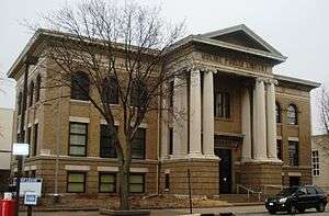 By the 1920s the downtown area featured bank buildings that contained office space on multiple floors above the main banking rooms on the first floor, as well as other office buildings. These buildings provided a variety of professional services. Two of the buildings were eight stories tall, the Fifth Avenue Building and a building that is now Chase Bank. The LeClaire Hotel, which opened in 1922, anchored the east side of the downtown area. On the west side of downtown is the imposing First Lutheran Church, which was built in 1876. Department stores, first floor specialty shops, theaters, hotels, restaurants and bars rounded out the businesses. Institutional structures such as the Carnegie Library (1904), City Hall (1914), Elks Club (1924) and the Unitarian Church (1928) were also built in the downtown business district.[2]