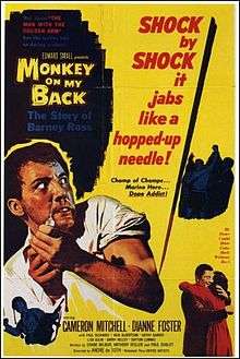 Monkey on My Back is a 1957 biographical film directed by Andre DeToth, starring Cameron Mitchell as Barney Ross, a world champion boxer and World War II hero (based on a real-life titleholder). The movie is heavily fictionalized, but both the movie character and the biographical character become addicted to opiates due to war conditions. In the climax of the film, Ross faces a challenging battle to recover from his addiction.[1]