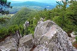 Monument Mountain is the name of a popular 503-acre (204 ha) open space reservation located in Great Barrington, Massachusetts on the southeast side of Monument Mountain. The reservation is centered on the 1,642 feet (500 m) subordinate summit of Squaw Peak. It is managed by The Trustees of Reservations, a non-profit conservation organization and is notable for its expansive views of the Housatonic River Valley, The Berkshires, the Taconic Mountains, and the Catskill Mountains of New York from the knife-edge summit of Squaw Peak. Monument Mountain, composed of erosion resistant quartzite, is of The Berkshires geology. The reservation receives over 20,000 visitors a year.