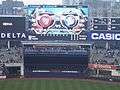 When the Yankees moved to their new ballpark, the Yankees established a new Monument Park in the new stadium.[7] An area was built behind the fence in straightaway center field, below the Mohegan Sun Sports Bar that serves as the batter's eye. Built of pearl blue granite from Finland,[8] this new monument park features the five Yankee monuments in a central area around a black marble Yankees logo. This is flanked by two short stone walls which hold the retired numbers. The plaques are mounted on the back wall and the September 11 monument is on one end of the park.
