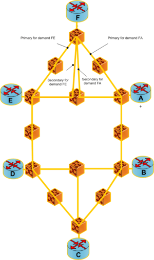 Shared backup path protection (SBPP) for multicast connections: The SBPP technique can be used for multicast connections at the optical layer because of its resource efficiency, due to the fact that the backup paths can share wavelength channels on links while their corresponding primary paths are link disjoint. Paths can share links with working paths and protection paths of other leaves. In Fig 4 FE and FA are primary paths. The optical line is reserved for shared protection of both FE and FA.