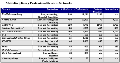 Today there are at least eleven networks. The largest are in the legal and accounting professions. A few of the legal and accounting networks include investment banking. The primary networks are focus on tax, employment, intellectual property, insurance and immigration.