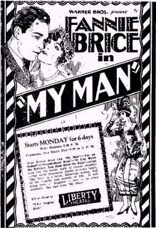 My Man (1928) is a black and white part-talkie American comedy-drama musical film from Warner Bros. starring Fannie Brice and featuring Guinn "Big Boy" Williams. It was Fannie Brice's feature film debut at the age of 37. She was a star in the Ziegfeld Follies before she started acting in motion pictures. At the time this movie was made there were still some silent movies in production and being released. It would not be until 1929 that talking movies would completely take over, but Warner Bros. had completely stopped making silent movies and switched to sound pictures by the end of that year, either part talking or full talking. Warners would also start making movies in color as well as sound movies.[3]