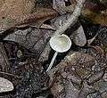 Mycena cyanorrhiza is a small white psychotropic mushroom which has a blue base. It grows in forests on wood and has a white spore print.