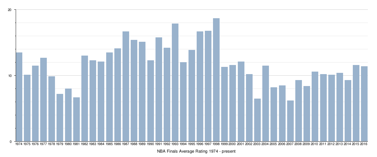 The highest rated and most watched NBA Final series was 1998 NBA Finals between the Chicago Bulls and Utah Jazz, the series averaged an 18.7 rating / 33 share and 29.04 million viewers on NBC. The lowest rated and least watched NBA Final series was 2007 NBA Finals between the San Antonio Spurs and Cleveland Cavaliers, the series averaged a 6.2 rating / 11 share and 9.29 million viewers on ABC.