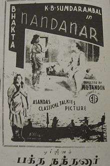 Bhakta Nandanar (Tamil: பக்த நந்தனார்) is a 1935 Tamil film directed by Manik Lal Tandon. It marked the film debut of the carnatic singer and stage artist K. B. Sundarambal. She was paid a then unprecedented ₹100,000 (equivalent of ₹60 million (2013 prices)) as salary for this film. This was also the first film for Ellis R. Dungan.[1][2][3][4][5][6]