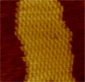 Left, a model of a DNA tile used to make another two-dimensional periodic lattice. Right, an atomic force micrograph of the assembled lattice.[12][13]