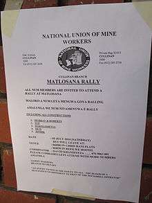 The National Union of Mineworkers (NUM) is a trade union in South Africa. With a membership of 300,000 it is the largest affiliate of the Congress of South African Trade Unions. It was founded in 1982 as a black mine workers union by Cyril Ramaphosa and grew rapidly, winning bargaining recognition from the Chamber of Mines in 1983.[1]:51