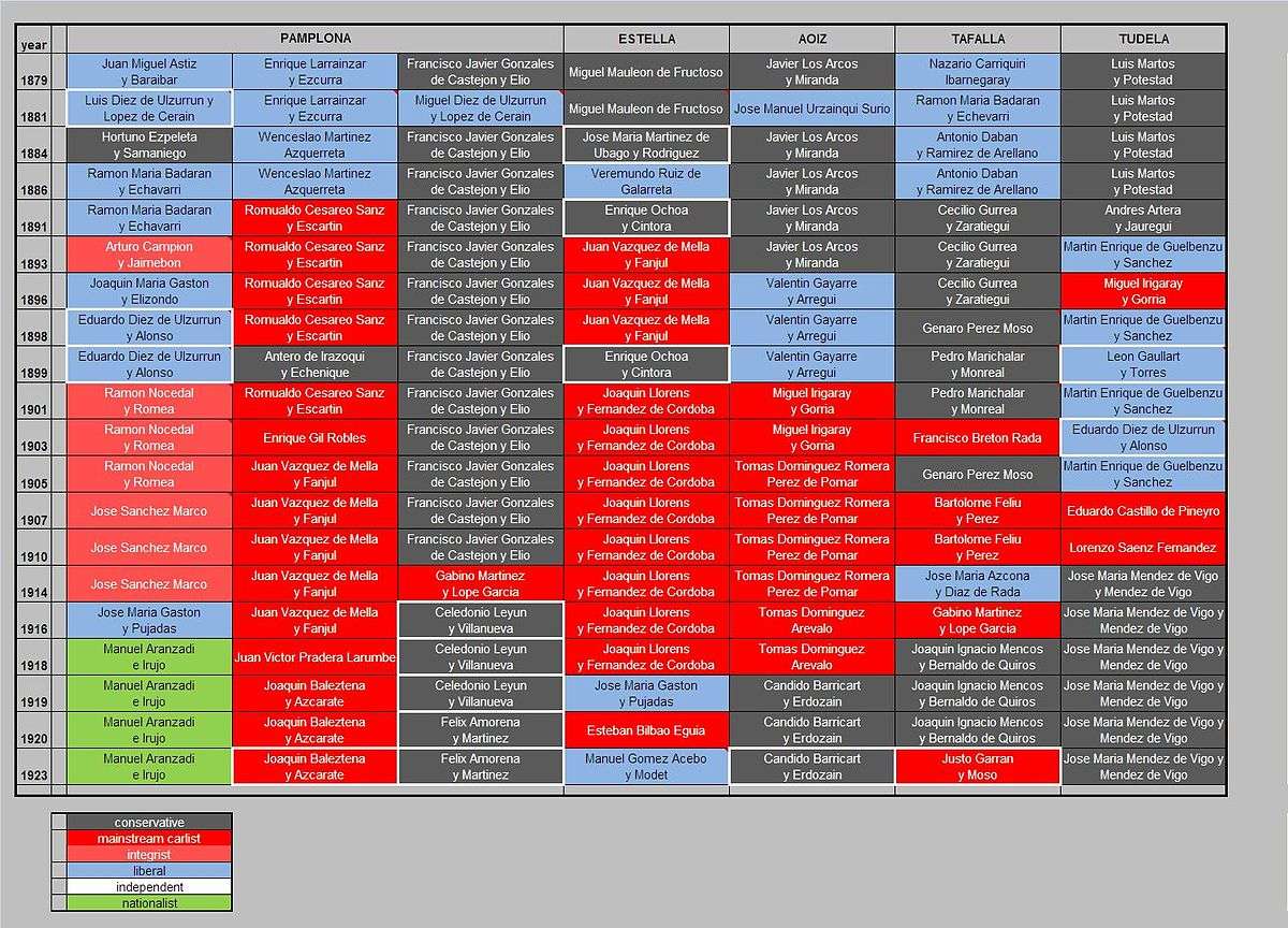 - ↑ against 3 Liberals and 1 democrat , see Partido Fuerista entry at Gran Enciclopedia Navarra