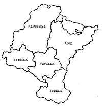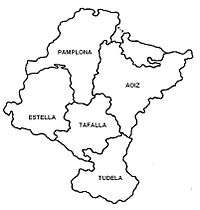 During the entire Restauración period Navarre was divided into 5 electoral districts, territorially roughly corresponding to the existing judicial districts;[1] 4 of them (Estella, Aoiz, Tafalla and Tudela) were categorized as “distritos rurales” with one mandate each, and 1 (Pamplona) enjoyed the status of a “circunscripción” with 3 mandates available. In both types of districts mandates were assigned according to the first-past-the-post system. In the 20th century the comarca of Améscoas was moved from the Pamplona district to the Estella district.[2]