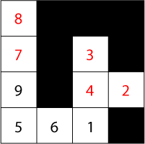 When the grid is completed, it must be possible to use every one of the 8 movements to journey from the number 1 to the number 2, from the number 2 to the number 3 and so on until you can move from the number 8 to the number 9. A movement must not take you through a black square.