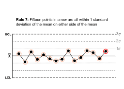 | | Fifteen points in a row are all within 1 standard deviation of the mean on either side of the mean. | ![]() | With 1 standard deviation, greater variation would be expected. |