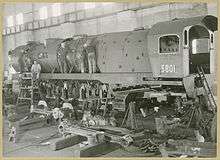 In 1943 approval was given for the New South Wales Government Railways Workshops to build 25 freight locomotives. The design was a modified version of the 57 class. The main alterations were the use of a rack and pinion valve gear[1] in lieu of the Gresley 2:1 conjugated vale gear for the middle cylinder and the use of smaller cylinders to enable the locomotives to run to on the Main North line to Broadmeadow, a route which had a tighter loading gauge. They also used a Woodard divided drive of twin coupling rods between the second and third driving wheels. A valance was fitted over the valve gear on the front platform.[2]