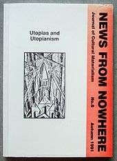 News from Nowhere (ISSN 0957-1868) was the journal of Oxford English Limited (OEL), a left-wing group of students and dons who sought progressive reforms to the Oxford University English Faculty syllabus between 1982 and 1992. News from Nowhere was created and edited by Tony Pinkney and ran for nine issues from 1986 to 1991. The first four issues mostly fought out the polemic with the Oxford English Faculty; issues 5 to 9 were thematically centered on pressing general issues in literary and cultural theory. As Josephine M. Guy and Ian Small note in their Politics and Value in English Studies: "There has been a long-standing debate in the Oxford periodical News from Nowhere about the future of English studies within that university".[1] Sets of News from Nowhere are available in the Bodleian Library, Oxford, Cambridge University Library, and the University of London Library;[2] and a one-volume selection from the journal is forthcoming from Kelmsgarth Press in 2015.[3]