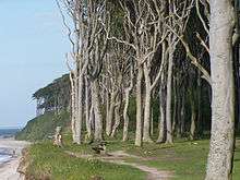 Large parts of the municipal territory are forested. West of the village lies Nienhagen Wood (Nienhäger Holz) immediately behind the roughly 12 metre high sea cliffs. This mixed forest is circa 180 hectares in area and is called Ghost Wood (Gespensterwald) by the locals. The origin of this description is not exactly known, but is probably derived from its 1.25 kilometre long and around 100 metre wide coastal strip of the wood, which is mainly stocked with beech and a few oaks. The beech trees, in particular, have been shaped by the sea winds, grow mainly on one side and have twisted, snake-like branches, which gives them a ghostly appearance especially at twilight and in the mist.