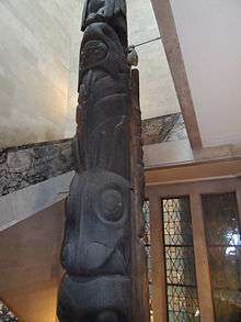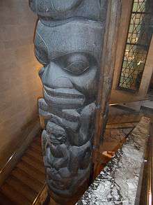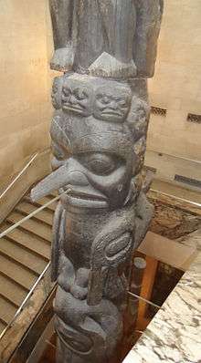 The Nisga'a and Haida Crest Poles of the Royal Ontario Museum are a collection of four large totem poles (sometimes referred to as "crest poles"), hand carved from western red cedar by the Nisga’a people and Haida people of British Columbia's coast. The poles are referred to as: Three Persons Along (Nisga'a); the Pole of Sag̱aw̓een (Nisga'a); the Shaking Pole of Kw’ax̱suu (Nisga'a); House 16: Strong House Pole (Haida). Each of the crest poles tell a family story, as carved figures represent crests that commemorate family history by describing family origins, achievements and experiences.[1] These memorial poles were typically placed in front of the owners' house along the beach.[2]