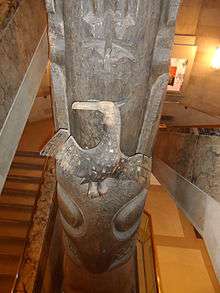 Notably, the largest of the four crest poles, the Pole of Sag̱aw̓een, stands over 24.5 metres (80 ft)[3] and is the tallest known example of a pole from the 19th century.[4] The poles can be found in the Royal Ontario Museum, just outside the Daphne Cockwell Gallery of Canada: First Peoples, where the central staircase of the museum winds around them. These crest poles are part of the museum's list of "must-see" iconic objects.[5]