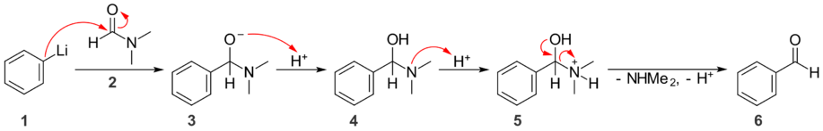 Here, phenyllithium (1) attacks the carbonyl group of DMF (2), giving tetrahedral intermediate 3. Because the dimethylamide anion is a poor leaving group, the intermediate does not collapse and another nucleophilic addition does not occur. Upon acidic workup, the alkoxide is protonated to give 4, then the amine is protonated to give 5. Elimination of a neutral molecule of dimethylamine and loss of a proton give benzaldehyde, 6.