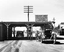 Design of the three checking stations was identical. Each one consists of two concrete block buildings: a single-story main building with a two-story guard tower at one corner and a smaller one-story guard house across the street.[1] Gun portals are visible on both buildings in each pair, and the windows on both buildings are protected by bulletproof glass.[8] Military police controlled a metal gate that extended between the pair of buildings.[1] Workers and visitors had to show special badges to the guards in order to pass through the gates.[8]
