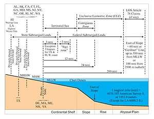 Each coastal state owns the territory extending 3 nautical miles (6 km) from the shore at mean low tide, and has jurisdiction to decide whether or not, and under what terms, to lease the territory for oil and gas. Exceptions include Texas and the west coast of Florida, which for historical reasons own the seabed out to 9 nautical miles (17 km) from the shore. Louisiana is included in the 3 nautical mile rule, but because it had active offshore leases defined before 1950 (and before most other states), its territory is measured using the Admiralty Nautical Mile, while other states use the International Nautical Mile, adopted by the United States in 1954.
