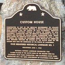 The Old Customhouse is a Spanish Colonial style adobe structure built around 1827 by the Mexican government in the Pueblo de Monterey, Alta California, in present day Monterey County in the U.S. state of California.[4][5] The Customhouse is the state's first designated California Historical Landmark, marking the site where U.S. Commodore John Drake Sloat raised the American flag and declared California part of the United States in 1846.[1]