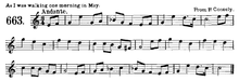 "As I Was Walking One Morning in May" appears as an Irish air in Stanford's 1905 edition of George Petrie's collection, bearing the attribution "From P. Coneely".[4] Its relation to extant ballads called "One Morning in May" is unclear.